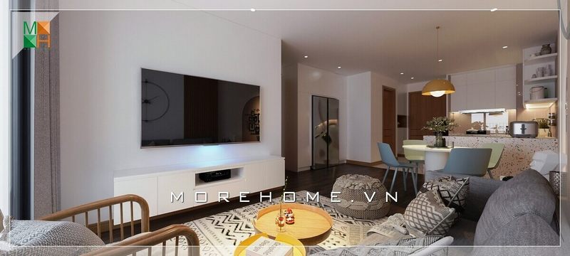 Thiết kế phòng khách chung cư ấn tượng với phong cách hiện đại trẻ trung và sinh động tạo nên một góc nhìn lôi cuốn.