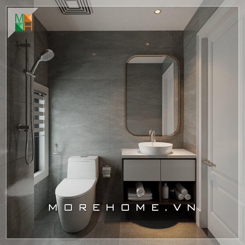 Thiết kế sử dụng gương lớn trong nhà tắm rất sang trọng khiến căn phòng tắm biệt thự, chung cư cảm giác rộng và sang trọng hơn.