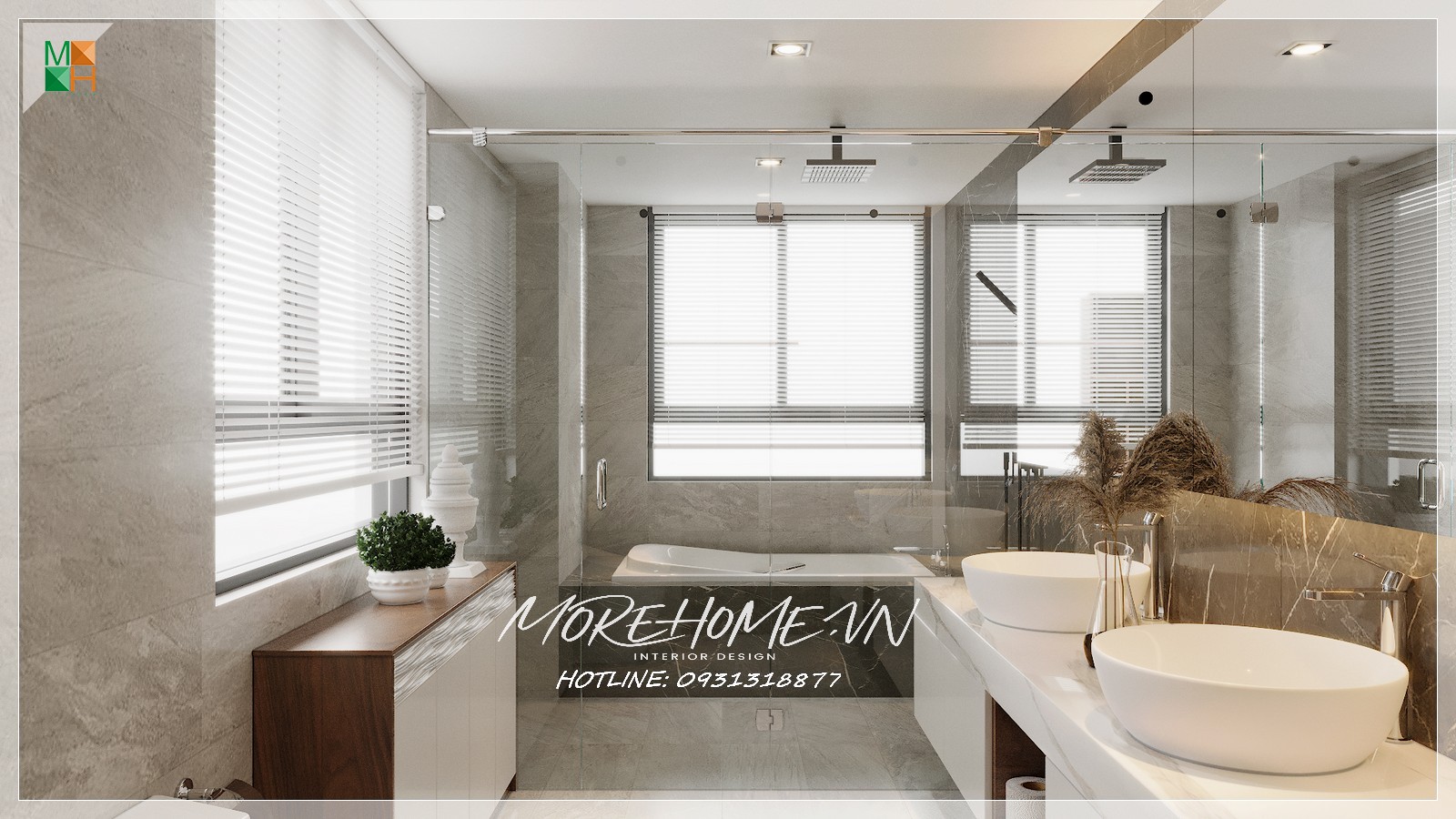 Ngoài ra thiết kế còn sửa dụng kính làm vách ngăn thông minh giữa nhà tắm với WC rất hiện đại.